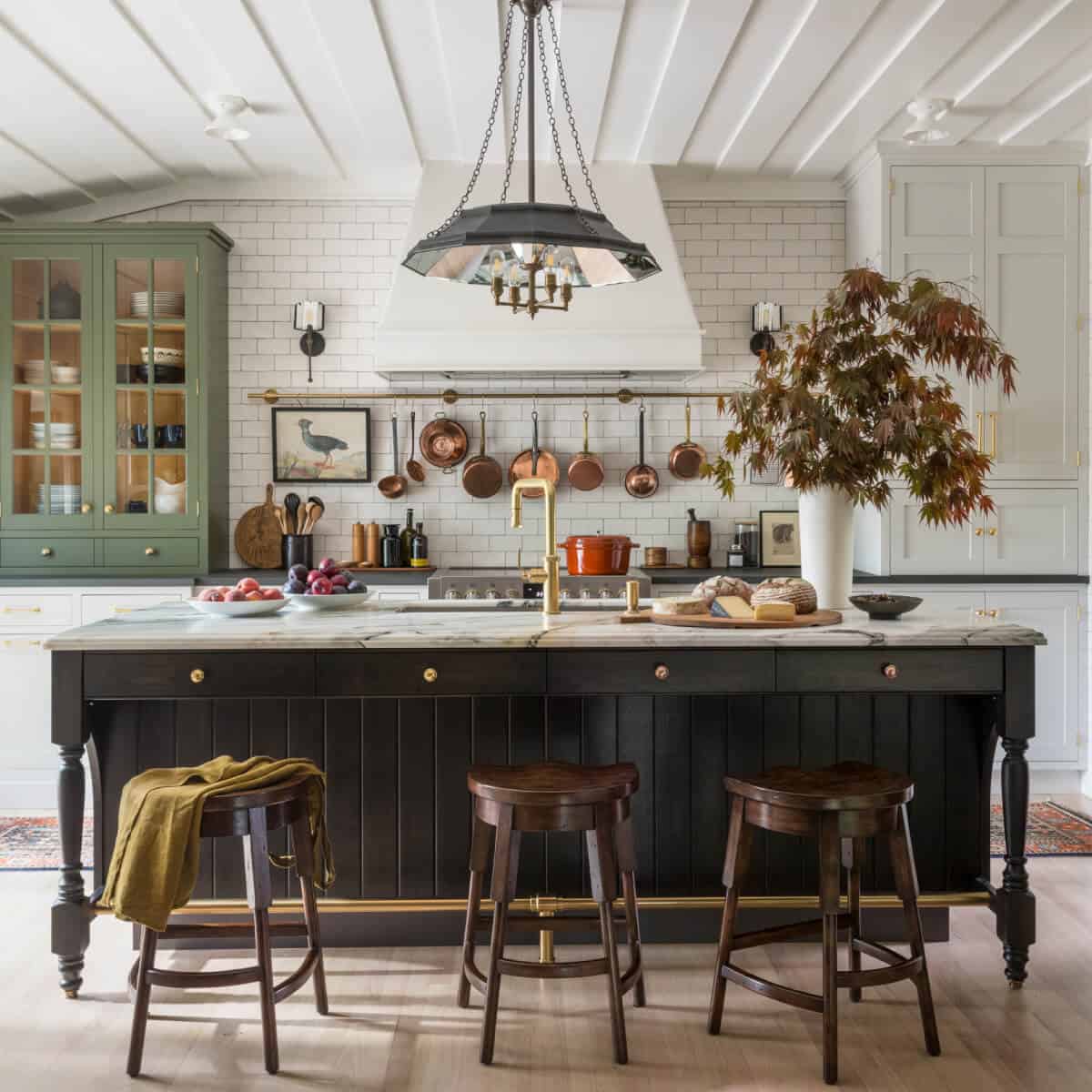 Hung along the eight-foot-long brass rail, Adam’s copper cookware collection offers a pretty punch of patina. The unlacquered brass knobs and pulls will soon follow suit. The black-and-stainless steel range from Fulgor Milano and the creamy cabinetry round out the mix-and-match palette.