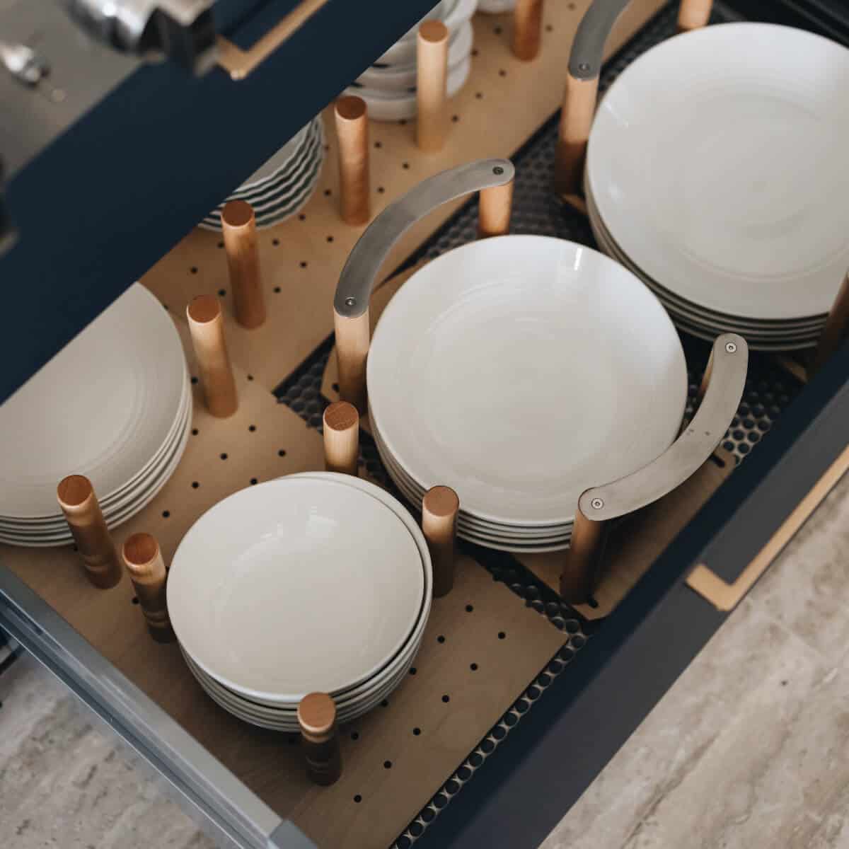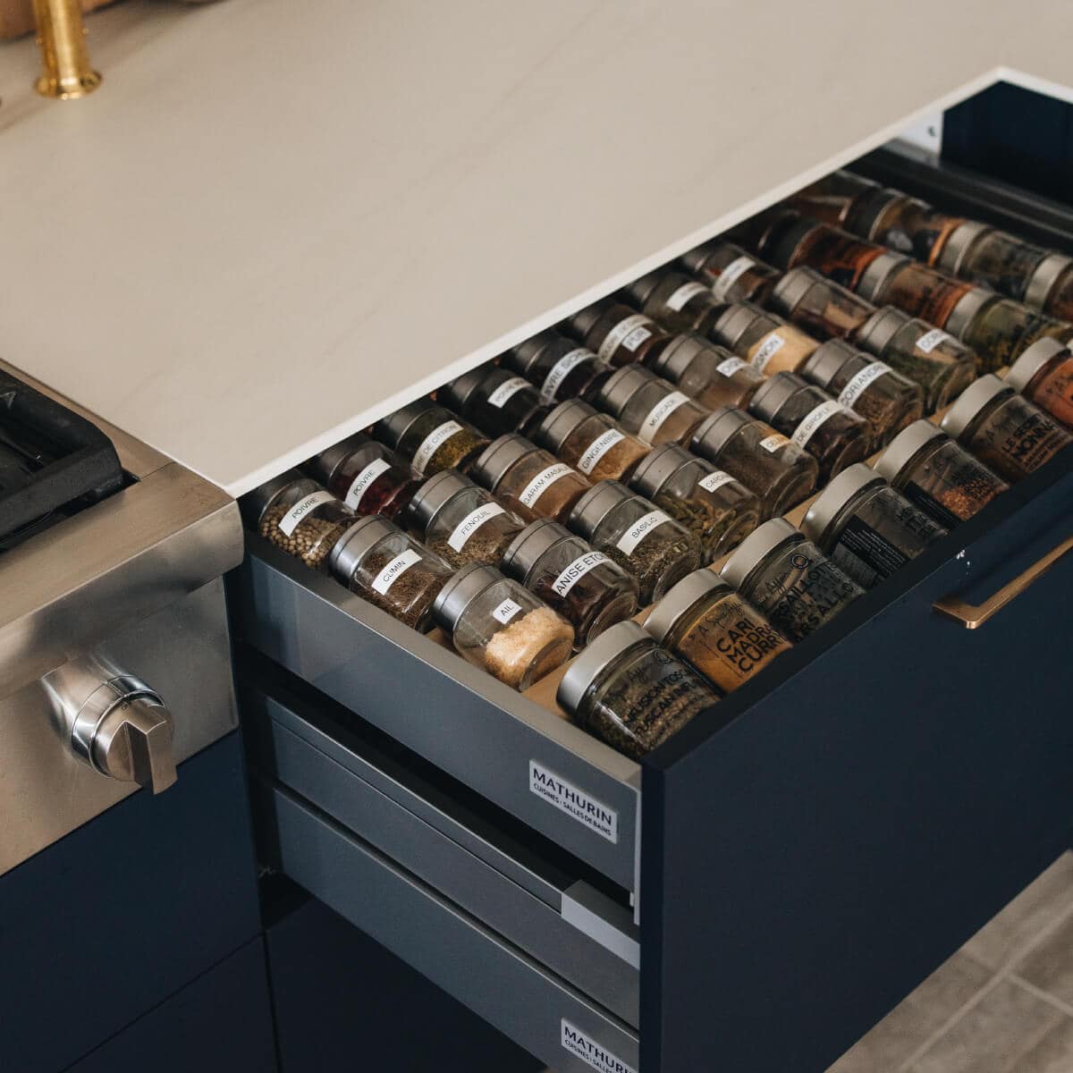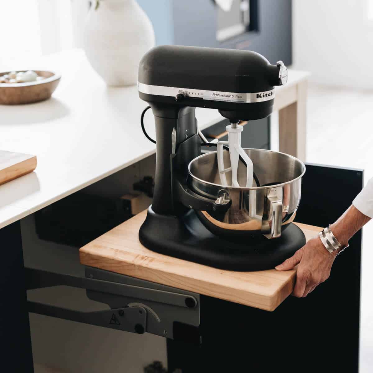 Large kitchens can sometimes be tiring to work in. Not only does it take more steps to move about, but over time, with all that extra space, it’s easy for disorganization to set in. So Mimi took extra care to add plenty of smart storage features: bespoke spice drawers and cabinetry pullouts not only help keep clutter under control but make it easier for her mum to work in. The highlight is a cantilevered arm made by Häfele and designed for a KitchenAid mixer, which is quite heavy. The arm fits inside a cupboard and raises or lowers the appliance at the touch of a finger.