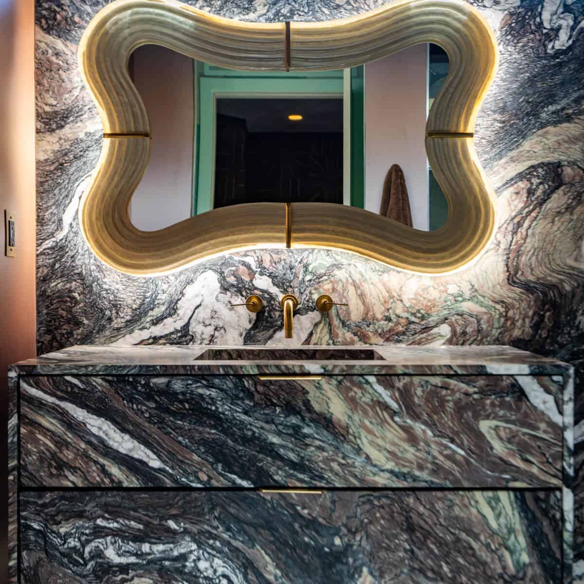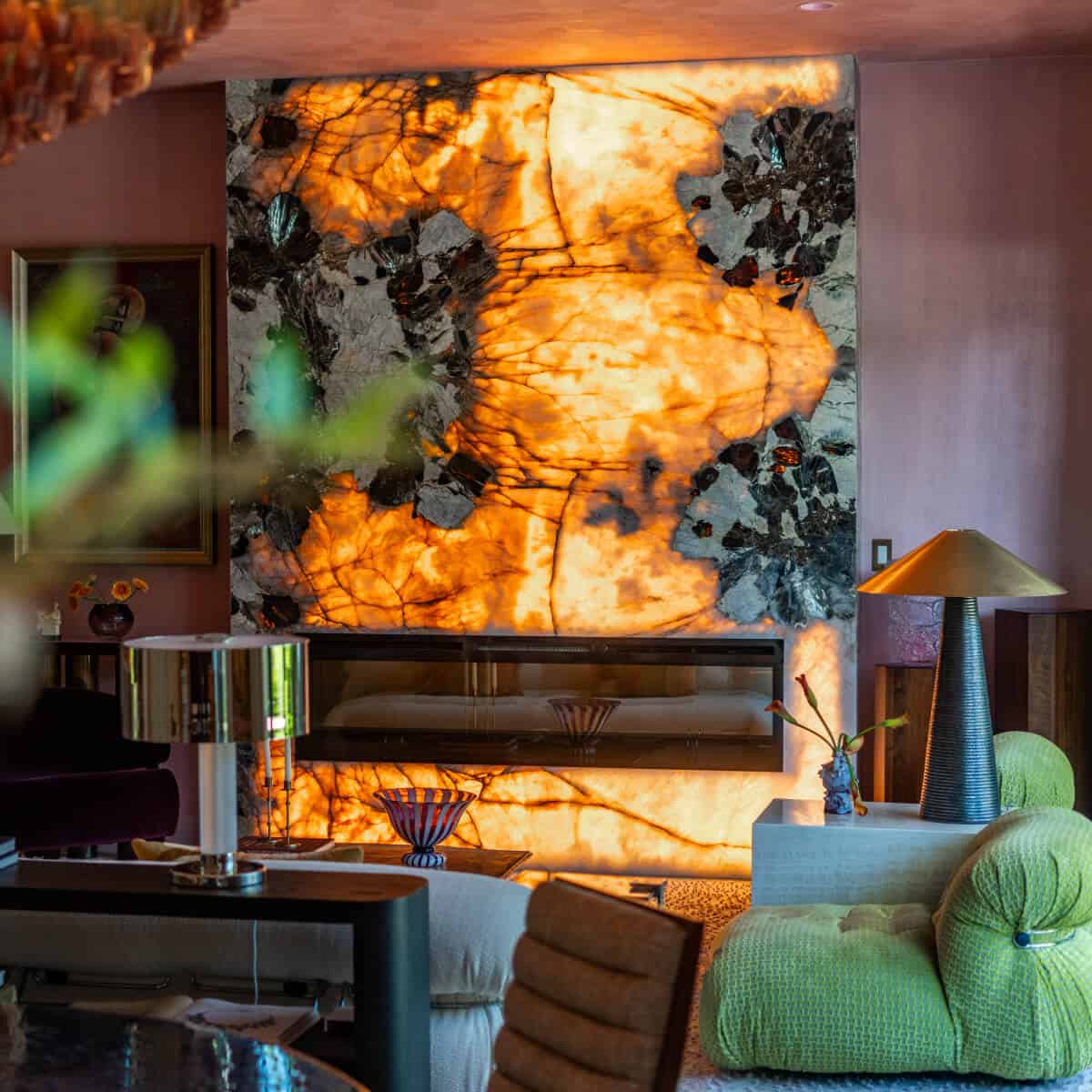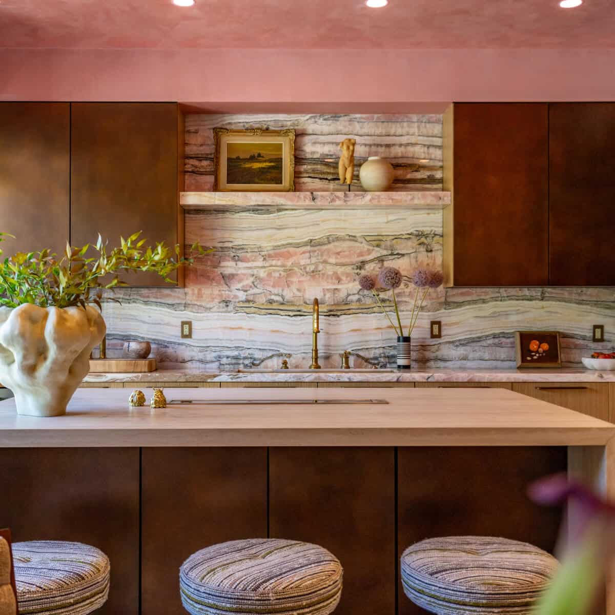 Then there is the “wow” moment: a stairwell featuring Italian marble treads, a 10-foot-long chandelier from Paris and an enormous pink-and-teal plaster mural titled New Beginnings. “This is where the story of our home begins—with a sense of drama, romance and reverence for the art of living,” the designer muses.