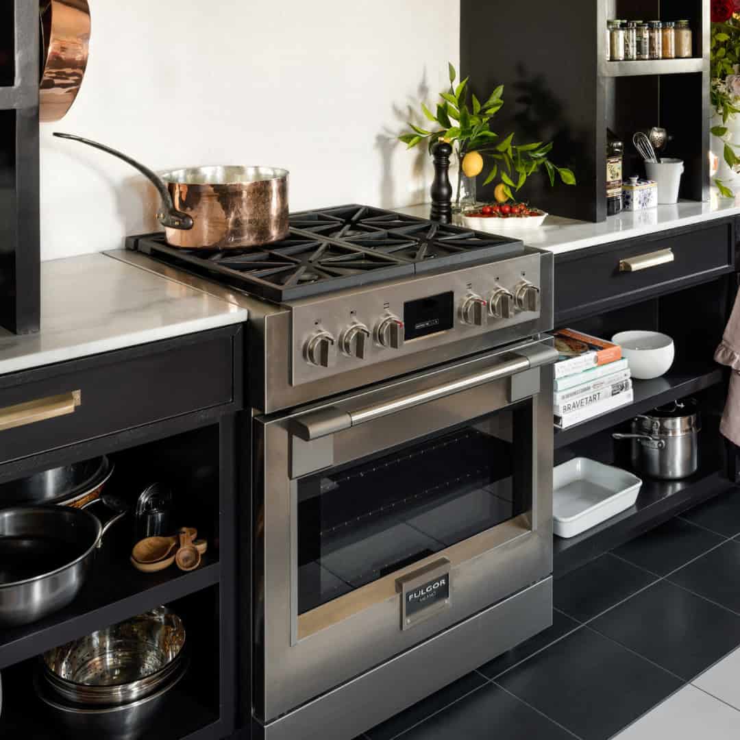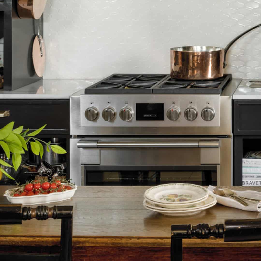Designer Tristan Gary was tasked with reimagining this 1908 home in Everett, WA, after it was purchased by a familiar client: her mother Nancy Williams. Both mother and daughter wanted to preserve the house’s history and give the space an antique look, so Gary set out to create an “un-kitchen” for Williams, who loves vintage. The catch? Williams is also a former restaurant mogul, so Gary had to deliver a chef ’s kitchen that didn’t look like one. The inspiration began with a 30-inch gas Fulgor Milano range. “When I think of Italian, I think of high style and high food,” Gary offers.